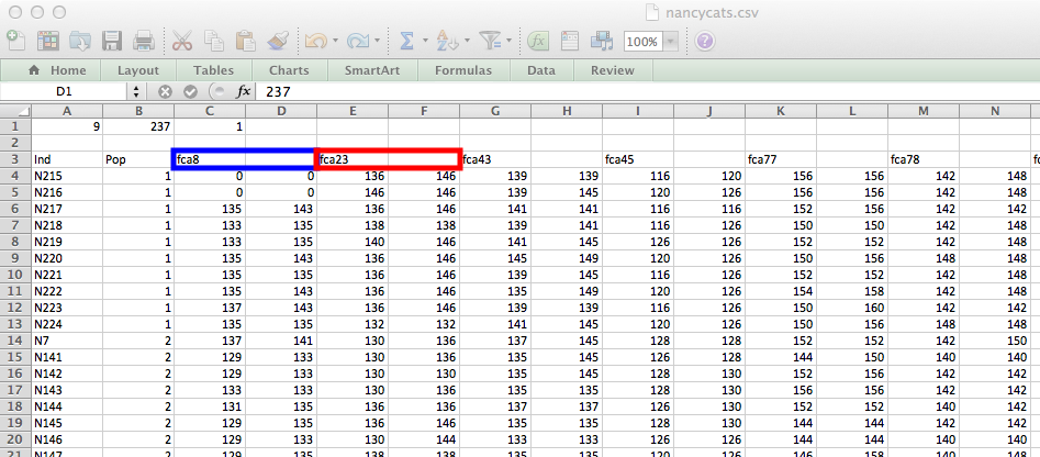 Diploid data is only different in the fact that you will have two alleles per locus. This is coded such that each allele is in a separate column. Below is an example of the nancycats data set (from the adegenet package), exported like above. Highlighted in blue and red are the first and second loci, respectively.