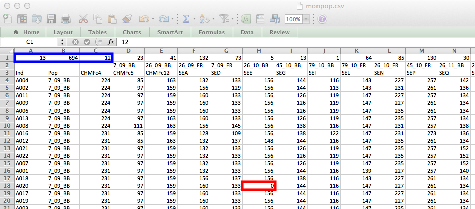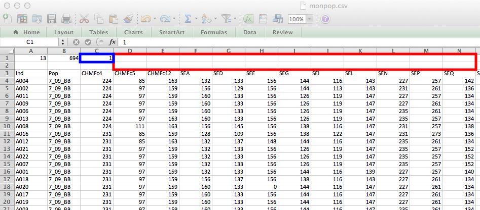 Below is what the monpop (haploid) data looks like. Highlighted in red is how missing data should be coded for SSR markers. Highlighted in blue are the parts of the metadata rows used by poppr. These three numbers represent: