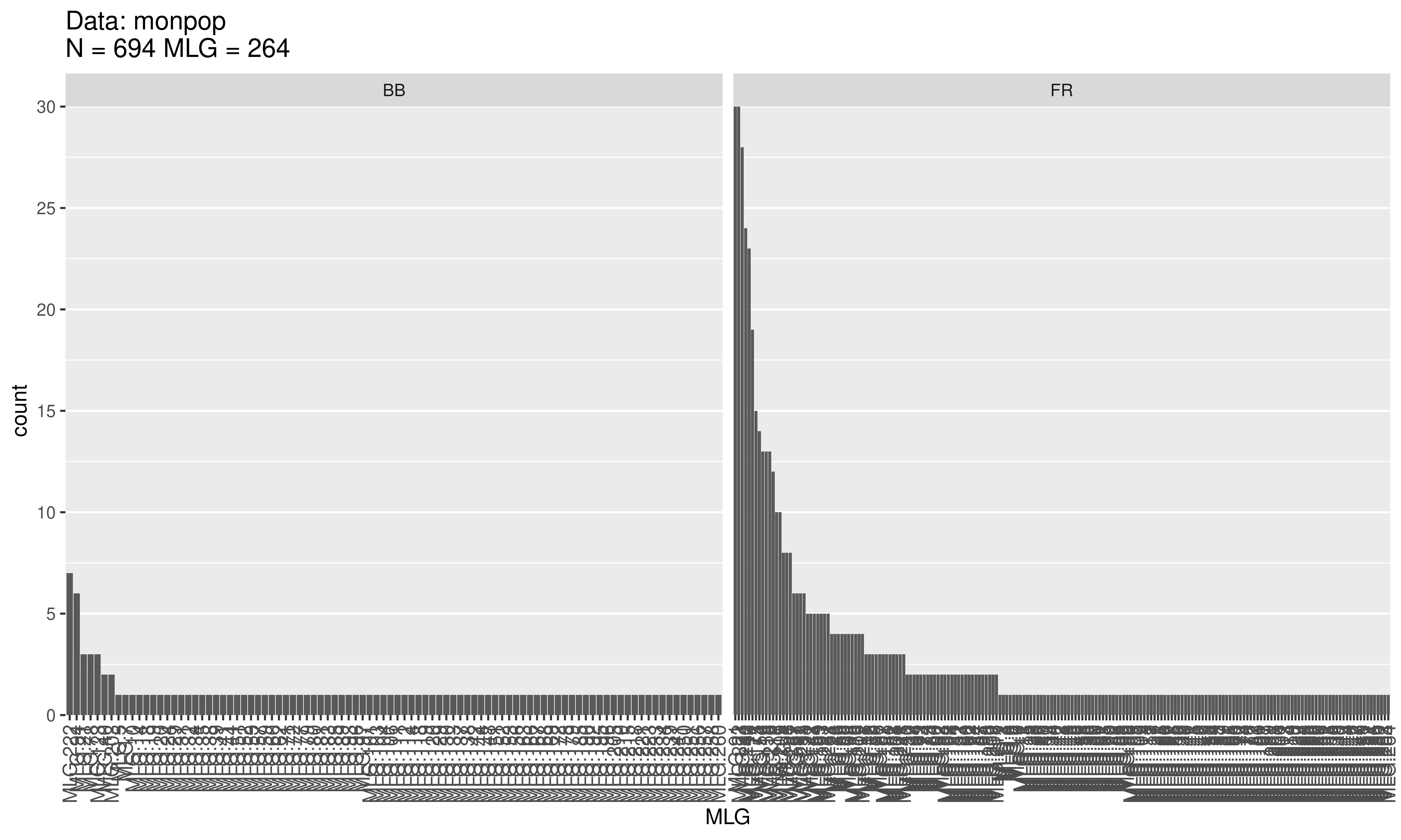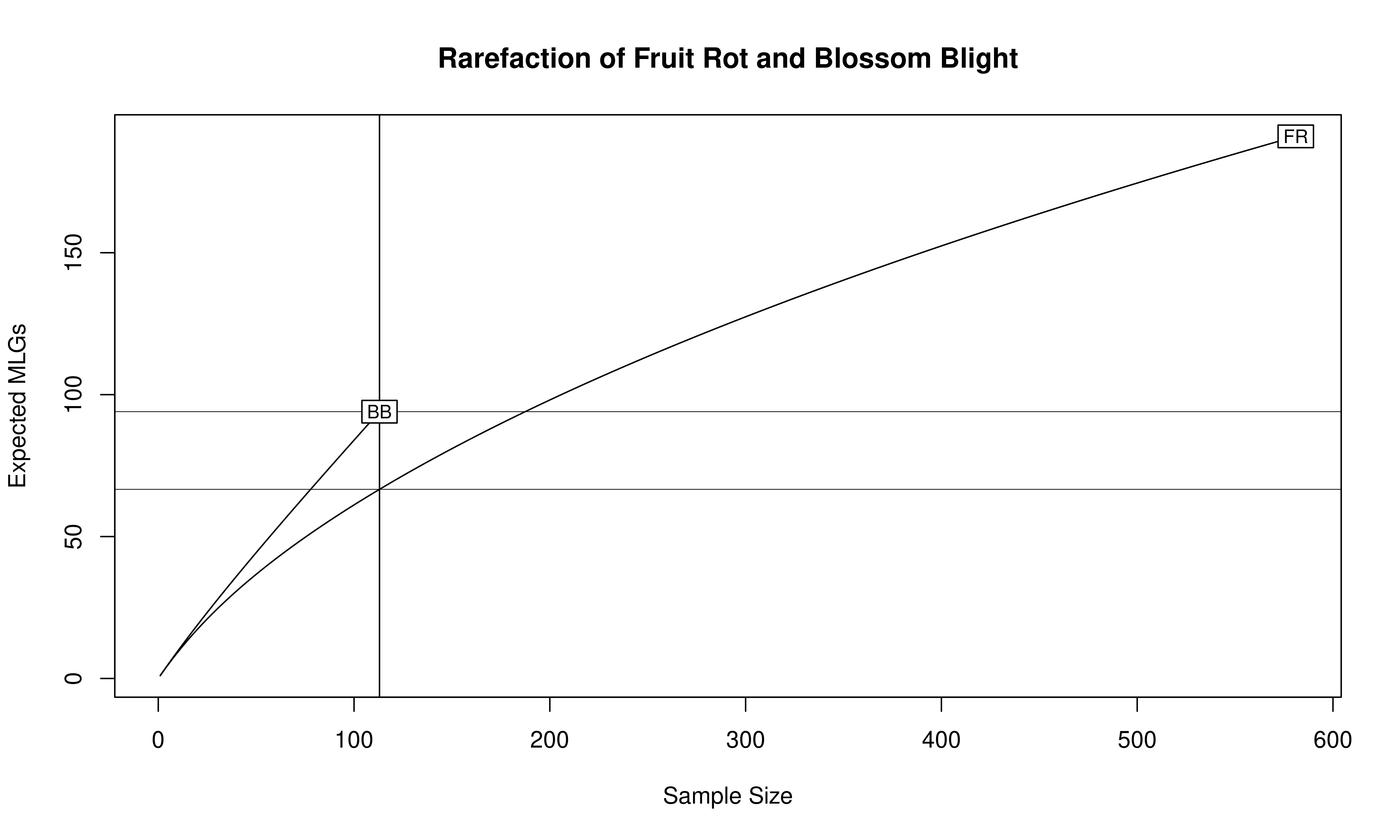 The number of observed \(MLGs\) is equivalent to genotypic richness. We expect that the BB population would have a higher genotypic richness than the FR population. However, looking at the raw number of MLGs for each symptom type, it shows us the opposite: there are 94 MLGs for BB and 191 MLGs for FR. This discrepancy has to do with the sample size differences, namely \(N = 113\) for BB and \(N = 581\) for FR. A more appropriate comparison is the \(eMLG\) value, which is an approximation of the number of genotypes that would be expected at the largest, shared sample size (\(N = 113\)) based on rarefaction. For BB (\(N = 113\)) the \(eMLG = 94\) and for FR (where \(N\) is set to 113) the \(eMLG\) = 66.6. Thus, genotypic richness is indeed higher in the BB populations than the FR population when considering equal sample sizes.