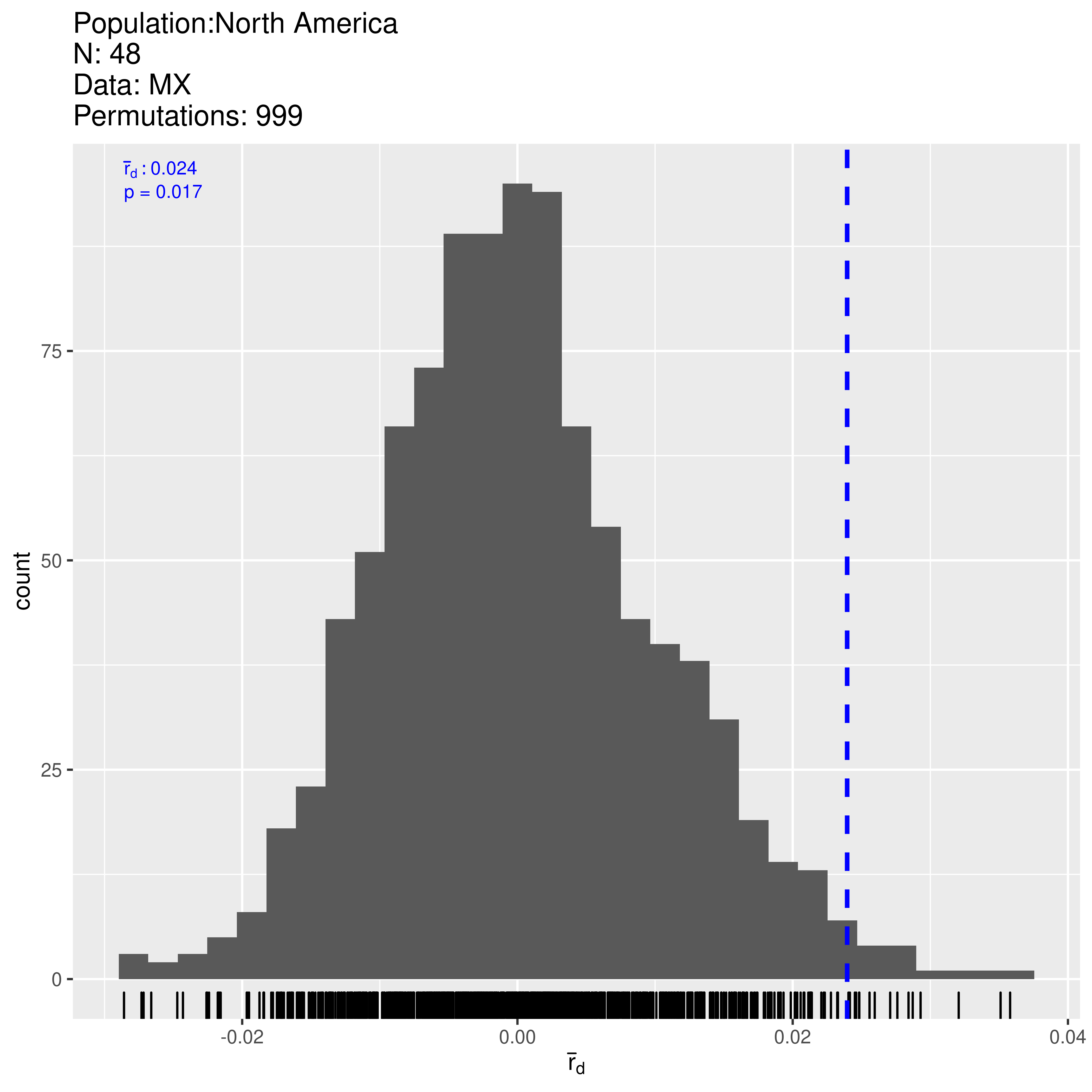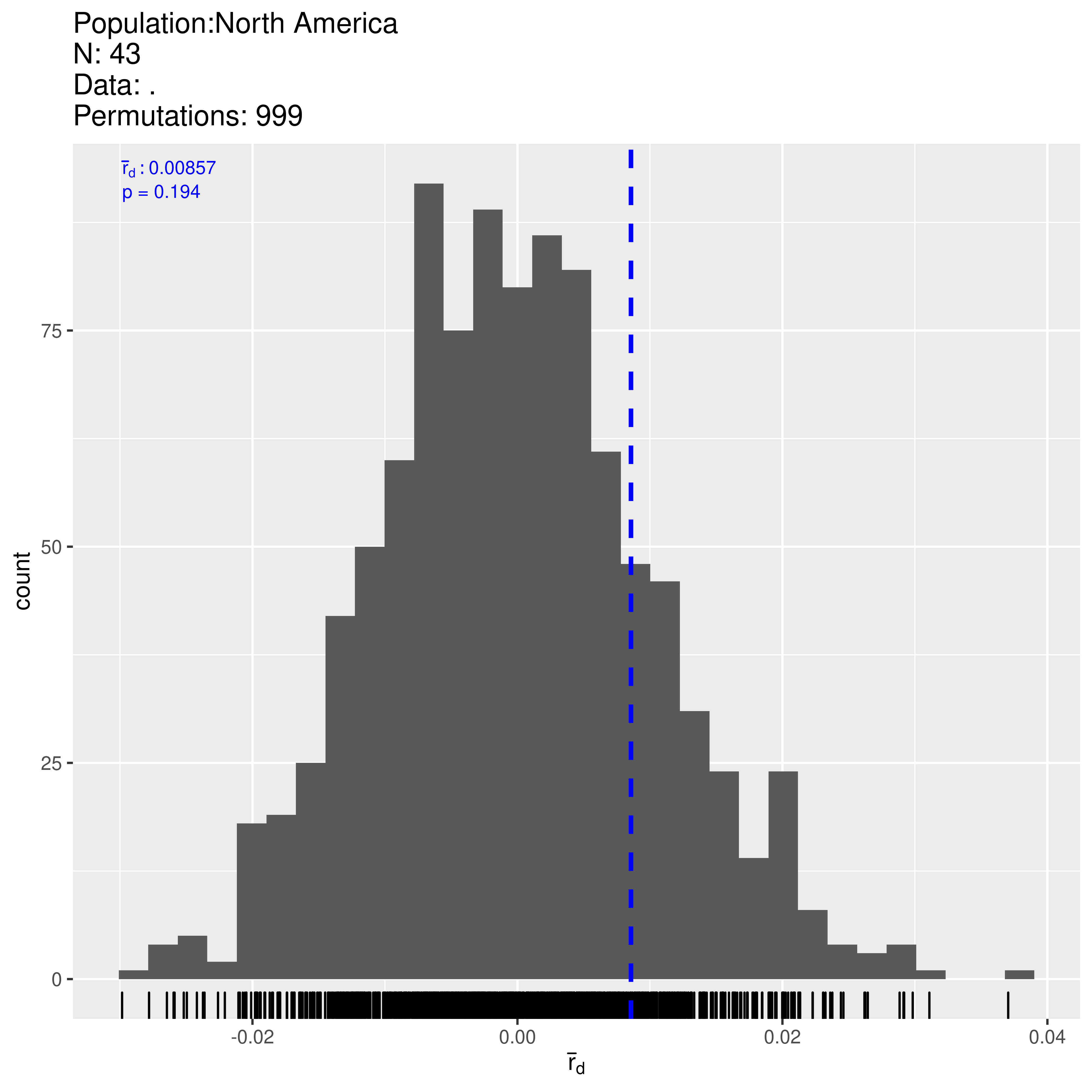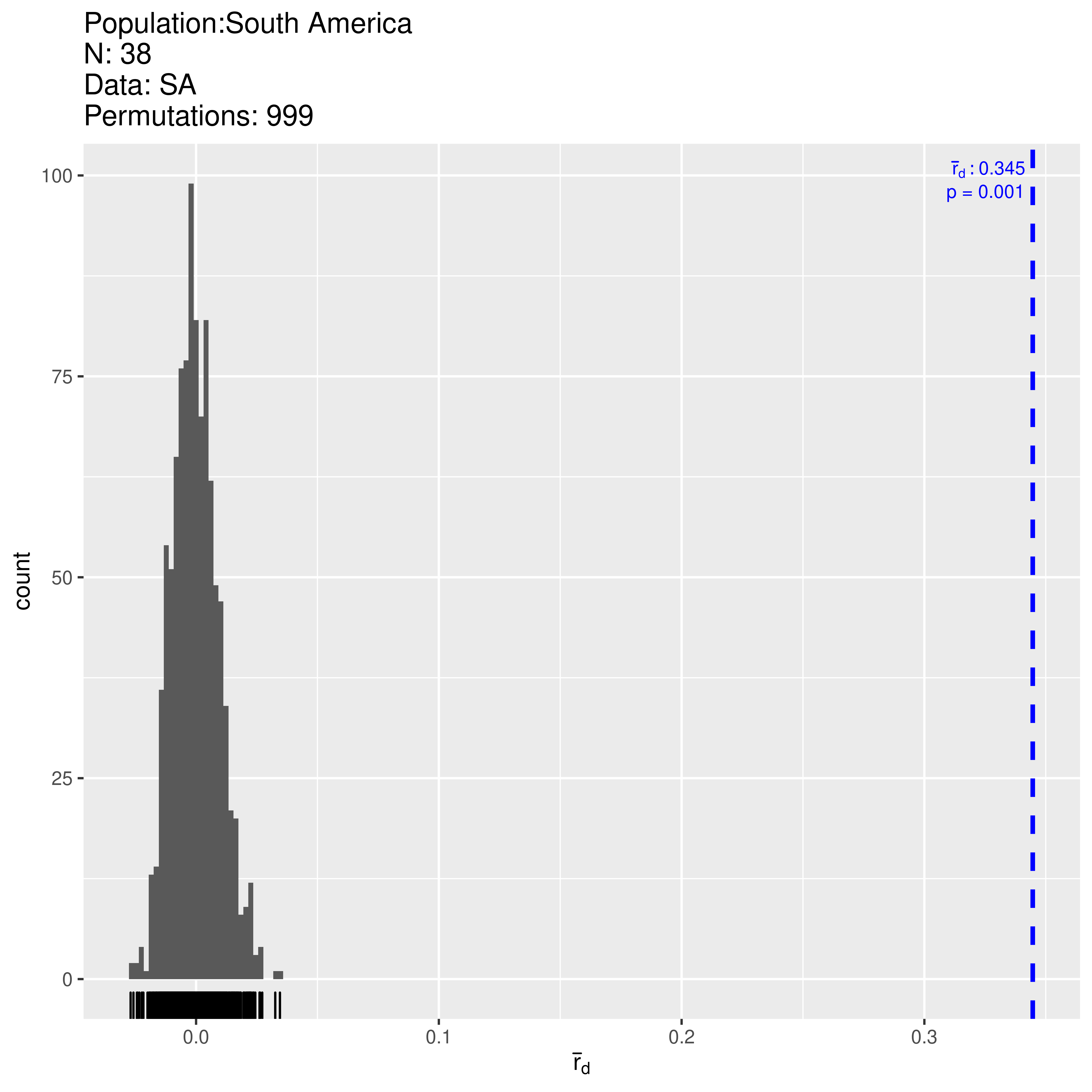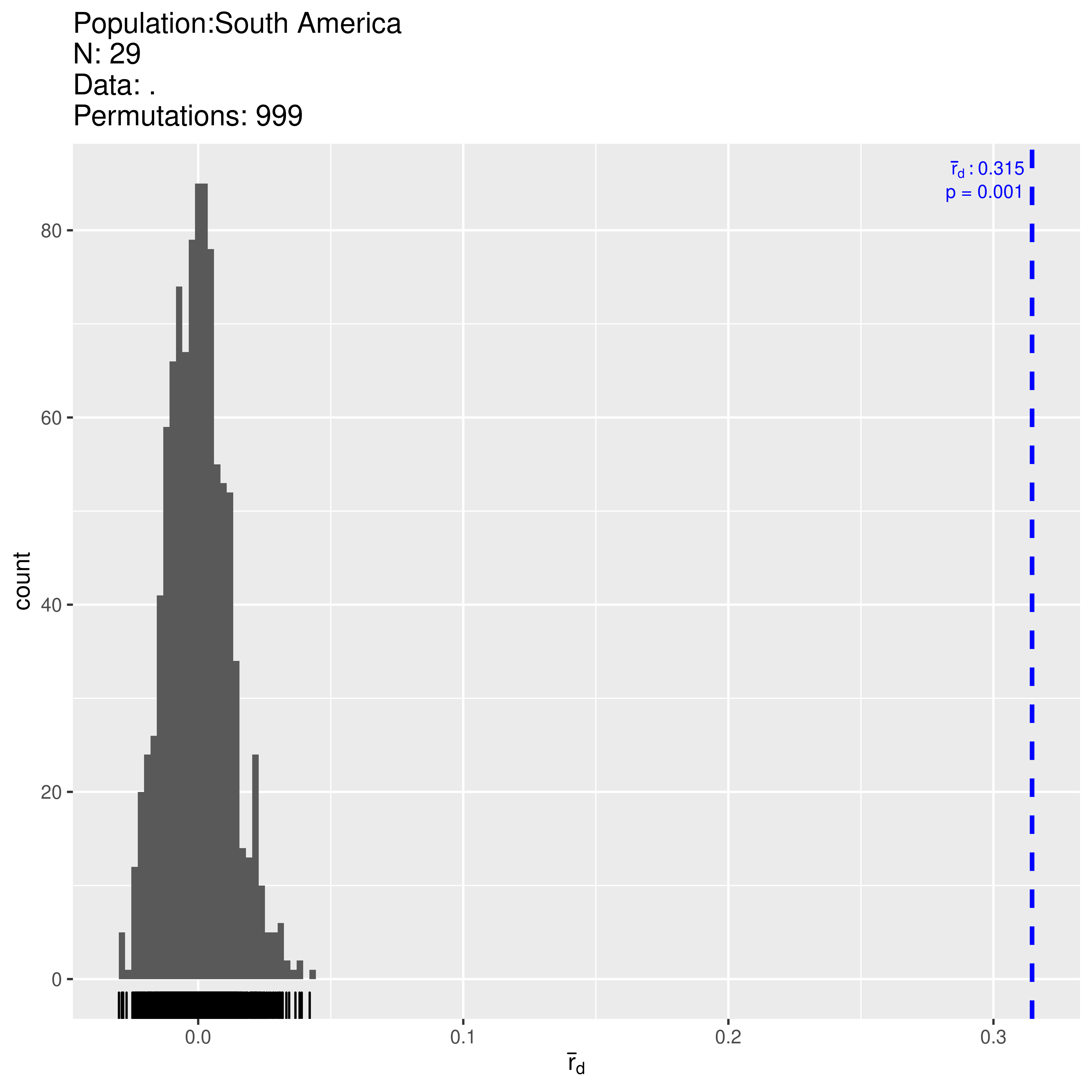 Next, we will analyze the North American population with the index of association and use 999 permutations of the data in order to give us a p-value. Note that the p-value is calculated with the original observation included.