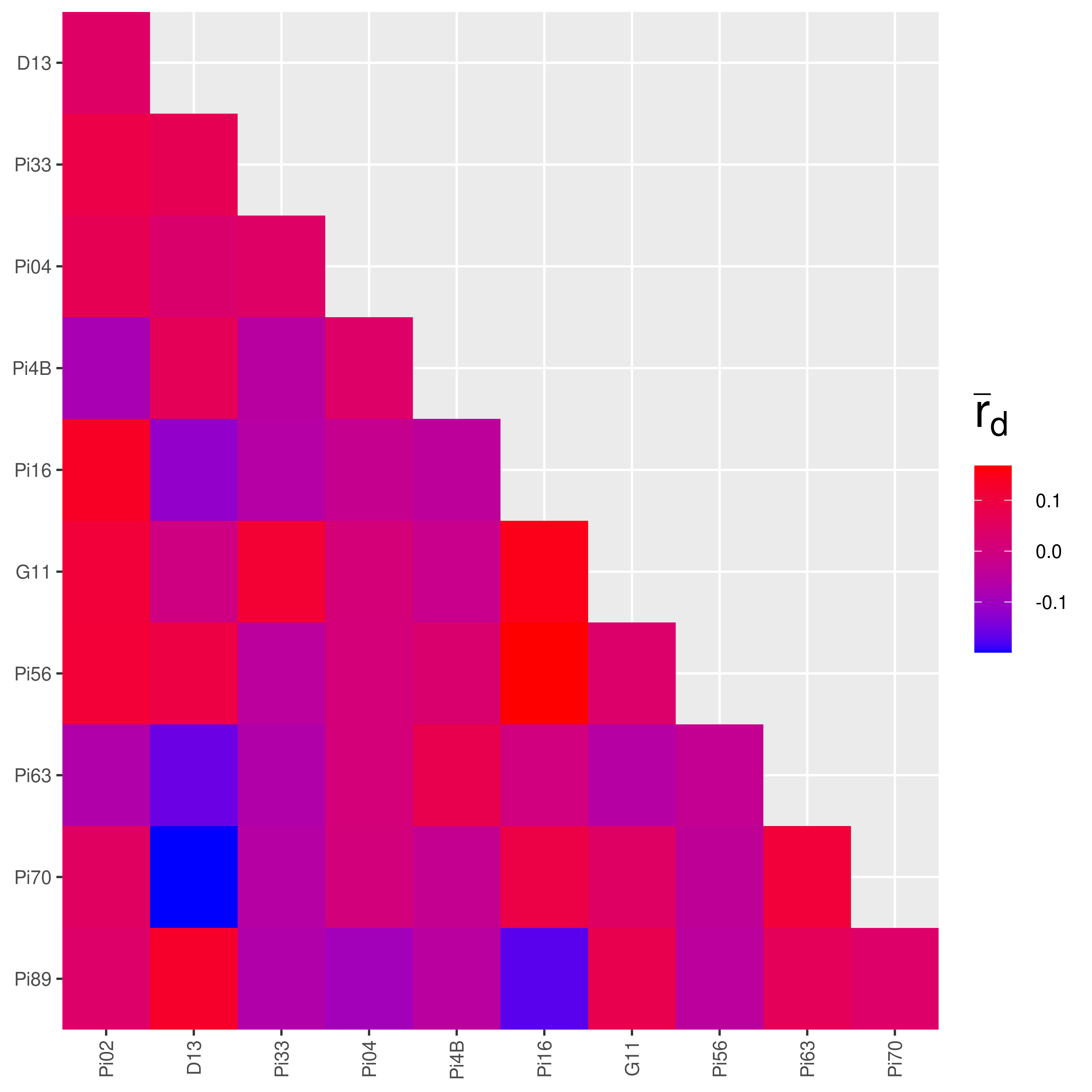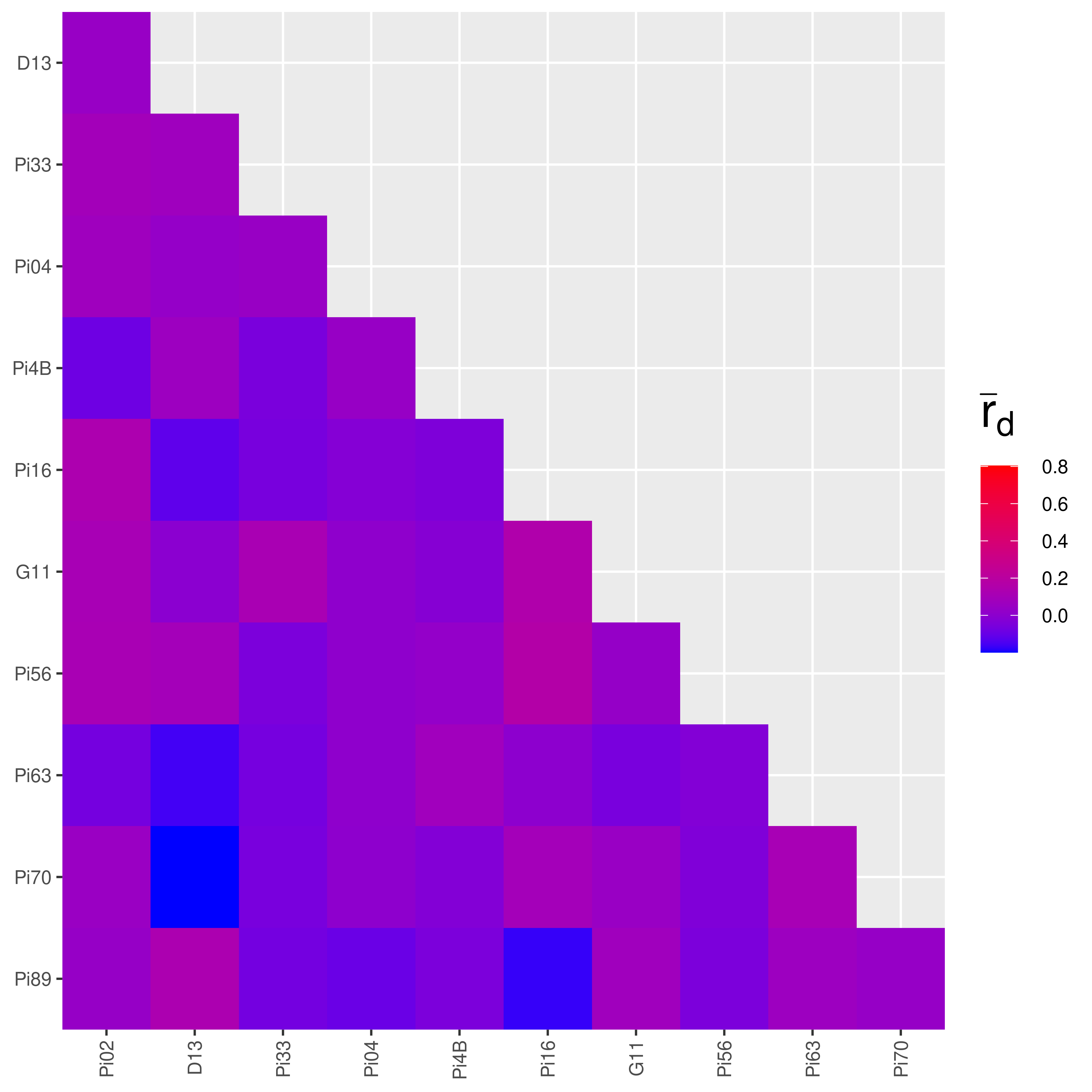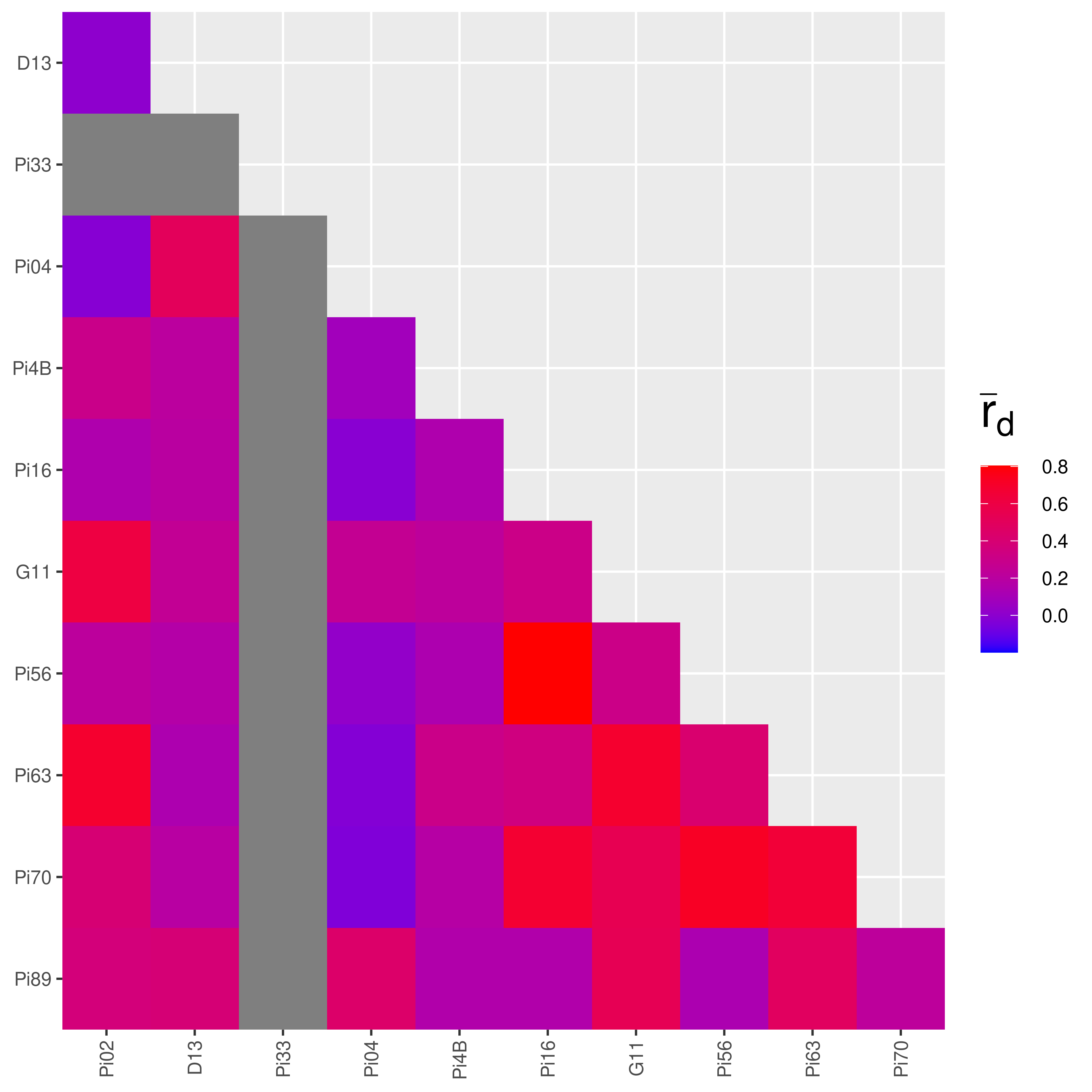We can see that most of the values from South America are indeed higher than in Mexico. Notice the value that says “NaN” in the South American data? That represents missing data. If you recall from the chapter on Locus Stats, the number of alleles at locus Pi33 for the South American population was 1. If you try to analyze the index of association on a locus with only one allele, you will get an undefined value. This is why the heatmap for the South American population has grey squares in it.