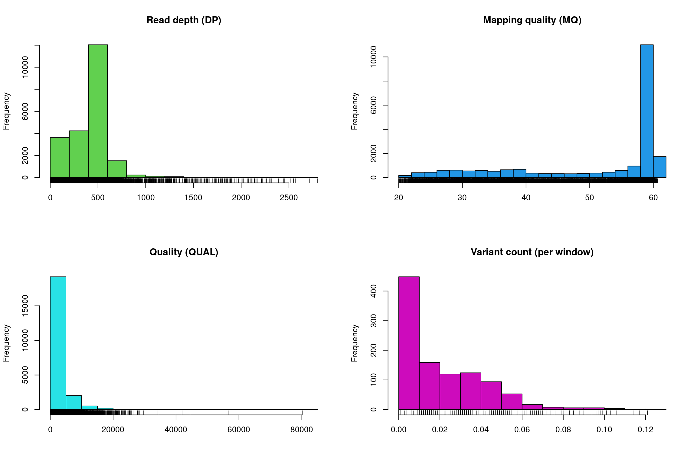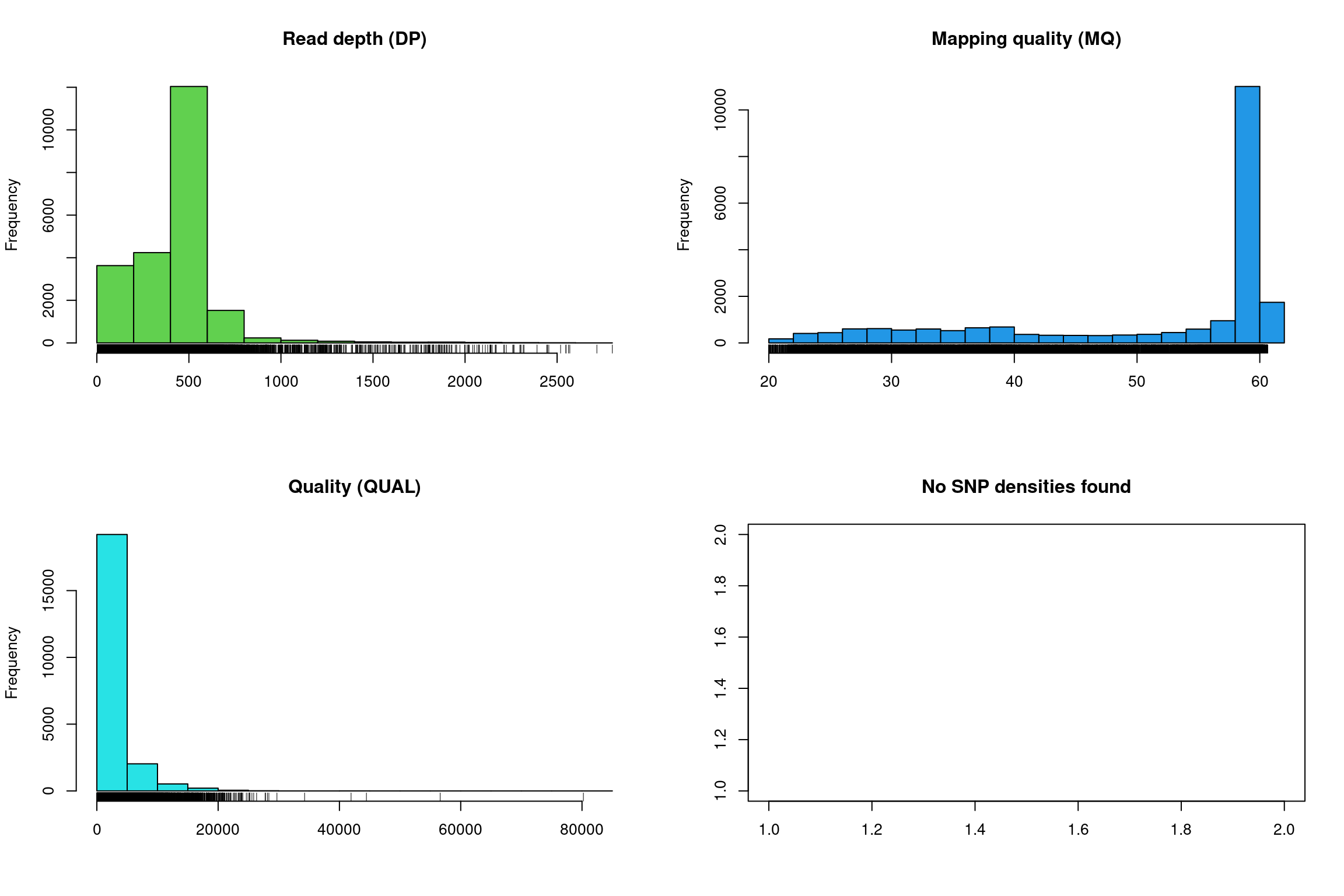 The read depth here is a sum over all samples. We see a peak that represents the depth where most of our genomes were sequenced at. Low regions of sequence depth may indicate variants where we may be concerned that there may not be enough information to call a genotype. Variants of high coverage may represent repetetive regions of genomes where the reference may not contain all the copies so the reads pile up on the fraction of repeats that were successfully assembled. These regions may violate the ploidy assumptions made by variant callers and therefore may be considered a target for quality filtering. Mapping quality is very peaked at 60 but also contains variants that deviate from this common value. Quality (QUAL) is less easily interpreted. It appears that most of our variants are of a low quality with very few of them being of high quality. It is important to remember that while everyone would like high quality, quality is frequently difficult to measure. The simplest interpretation here is that QUAL may not be a good parameter to use to judge your variants. The last panel for SNP densities is empty because this data is created during the processing of chromR objects, which we will discuss below.