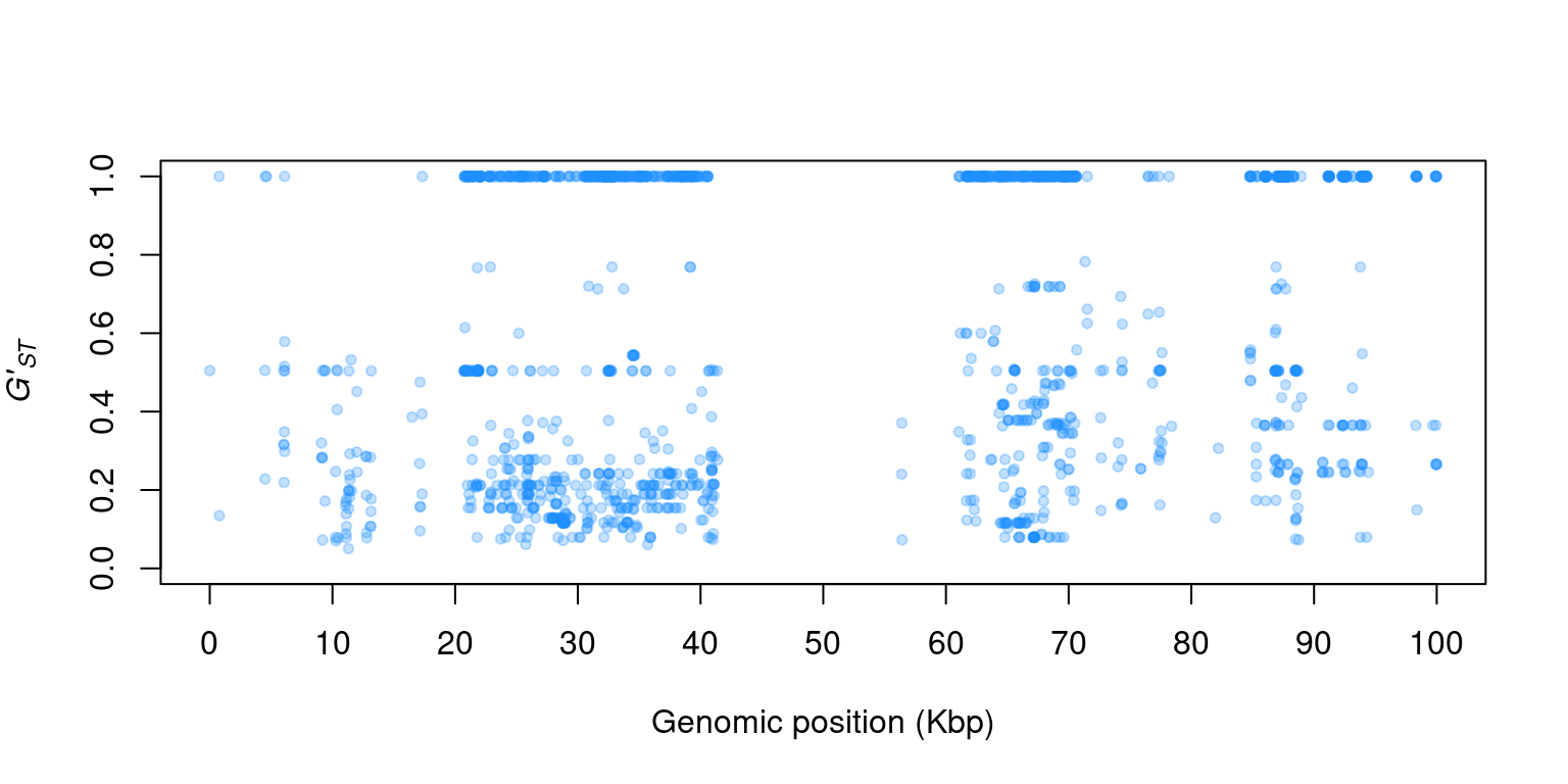 1) You actually have everything you need to make a Manhattan plot. Can you figure out how to plot \(G'_{ST}\) (y-axis) by genomic position (POS)?