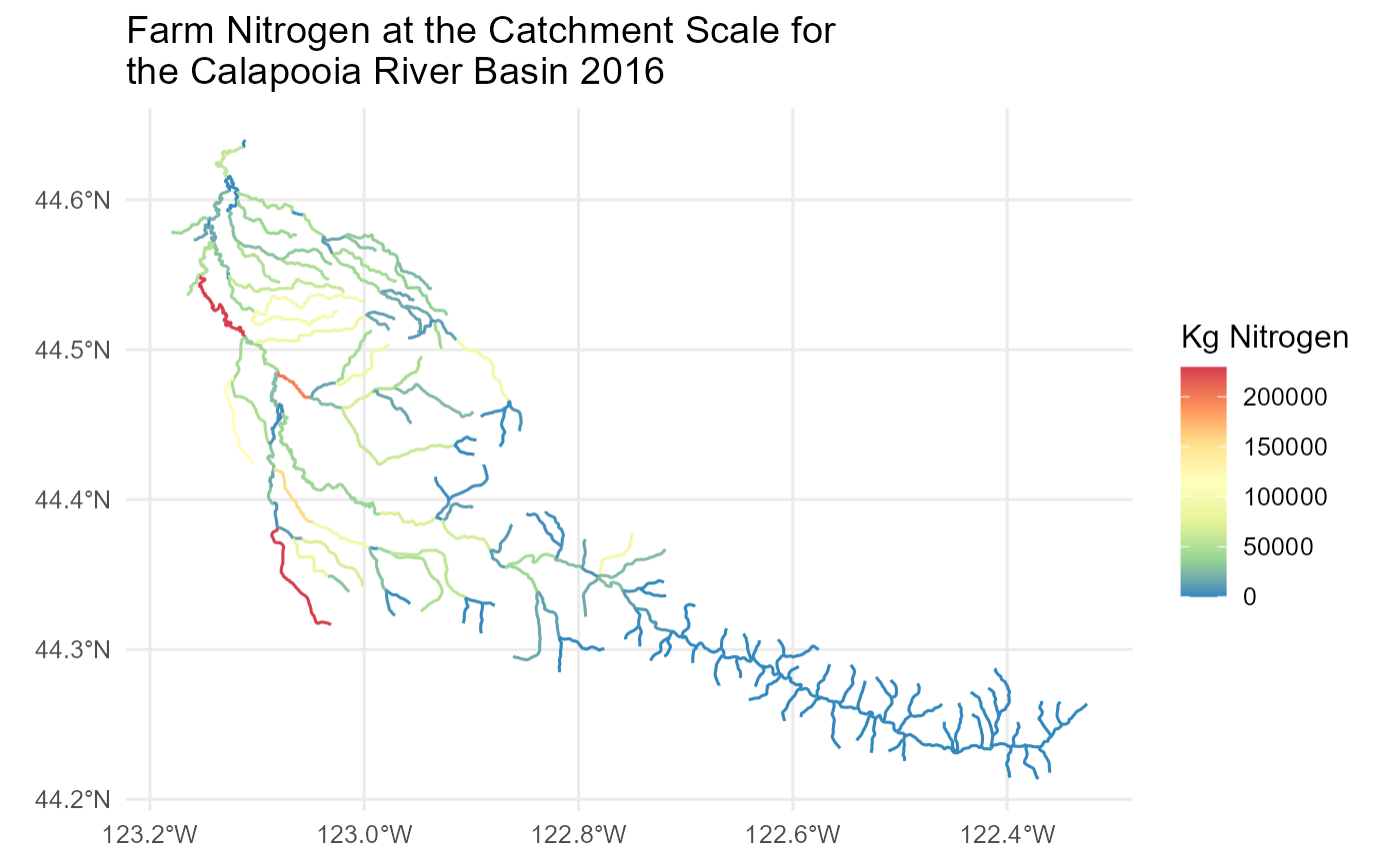 ggtitle('Farm Nitrogen at the Catchment Scale for \nthe Calapooia River Basin 2016')