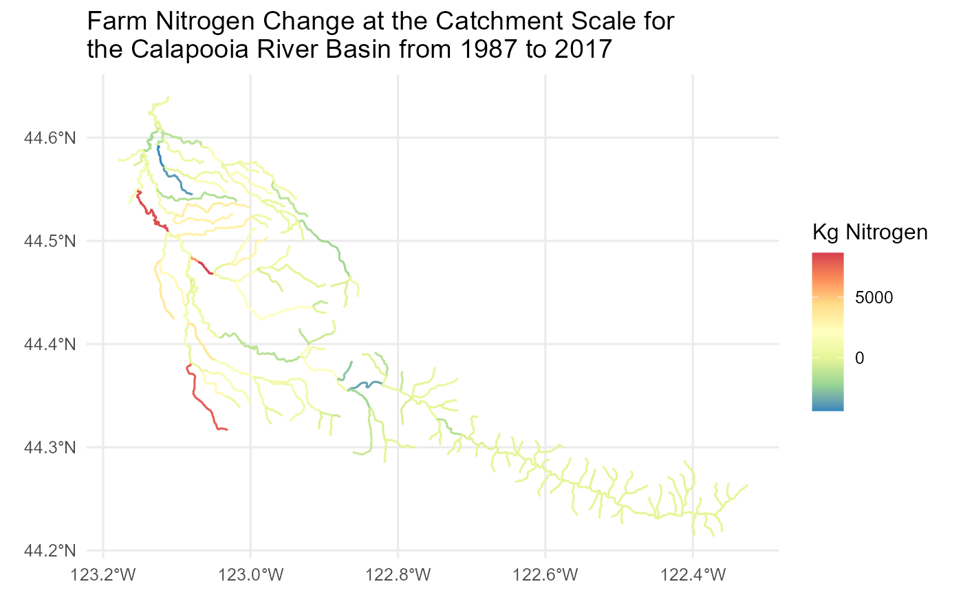 ggtitle('Farm Nitrogen Change at the Catchment Scale for \nthe Calapooia River Basin from 1987 to 2017')